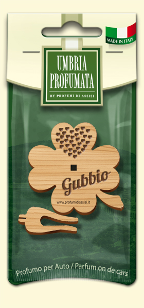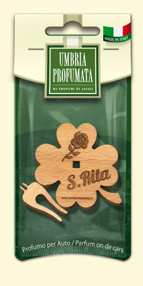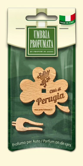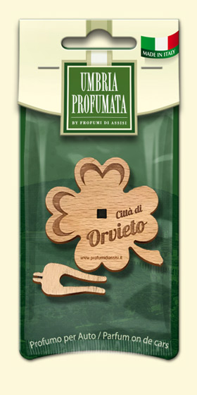 Quadrifogli Profumati per Auto realizzati in legno, con incisi i nomi di Santi e città dell’Umbria: Orvieto, Perugia e Santa Rita